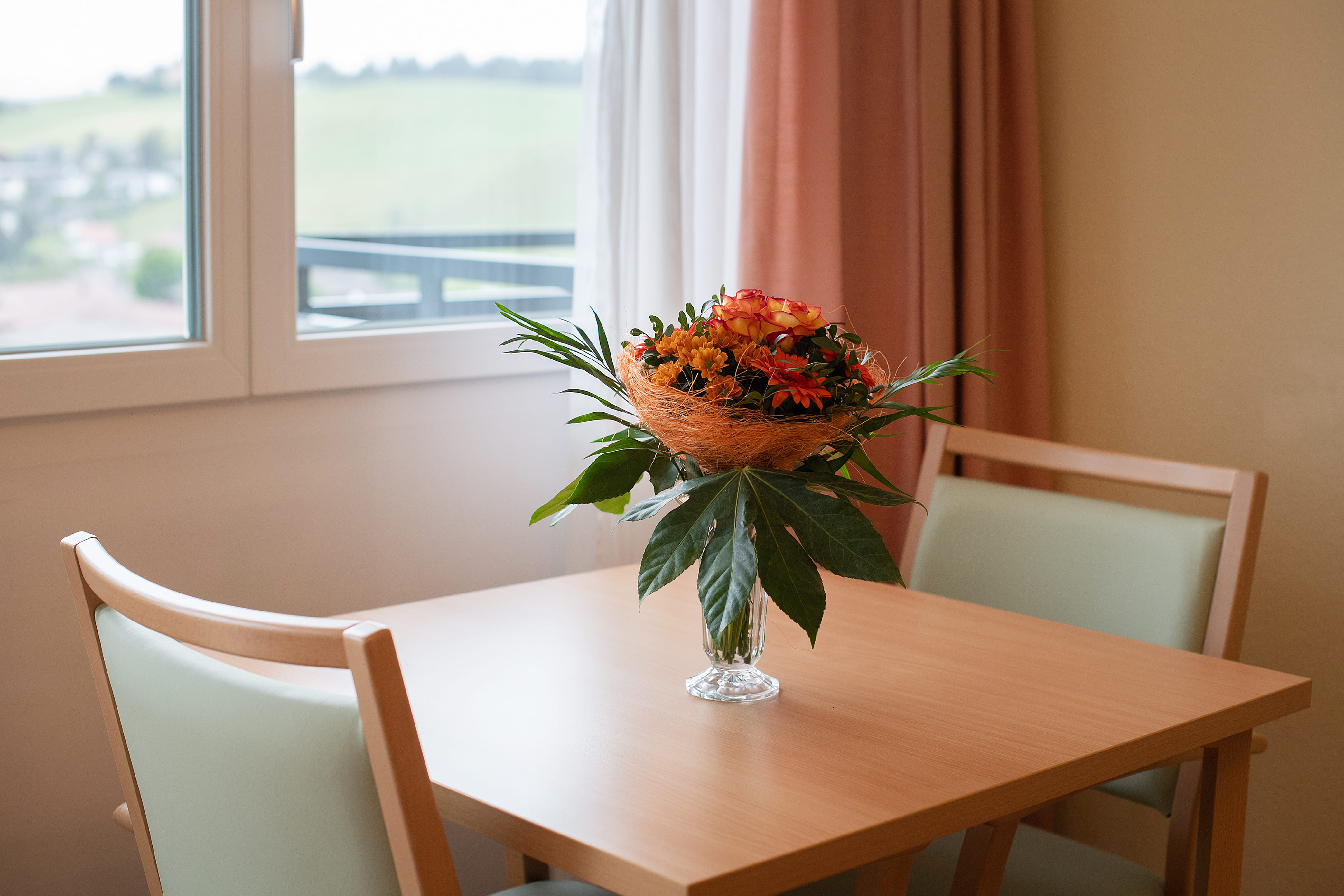 Die Stiftung Alters-Pflegeheim Riedacker befindet sich in Heimberg direkt am schönen Buechwald mit Sicht auf ein wundervolles Bergpanorama.