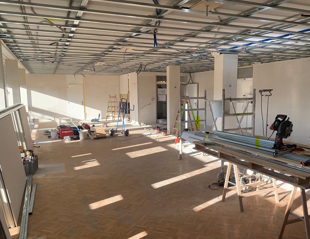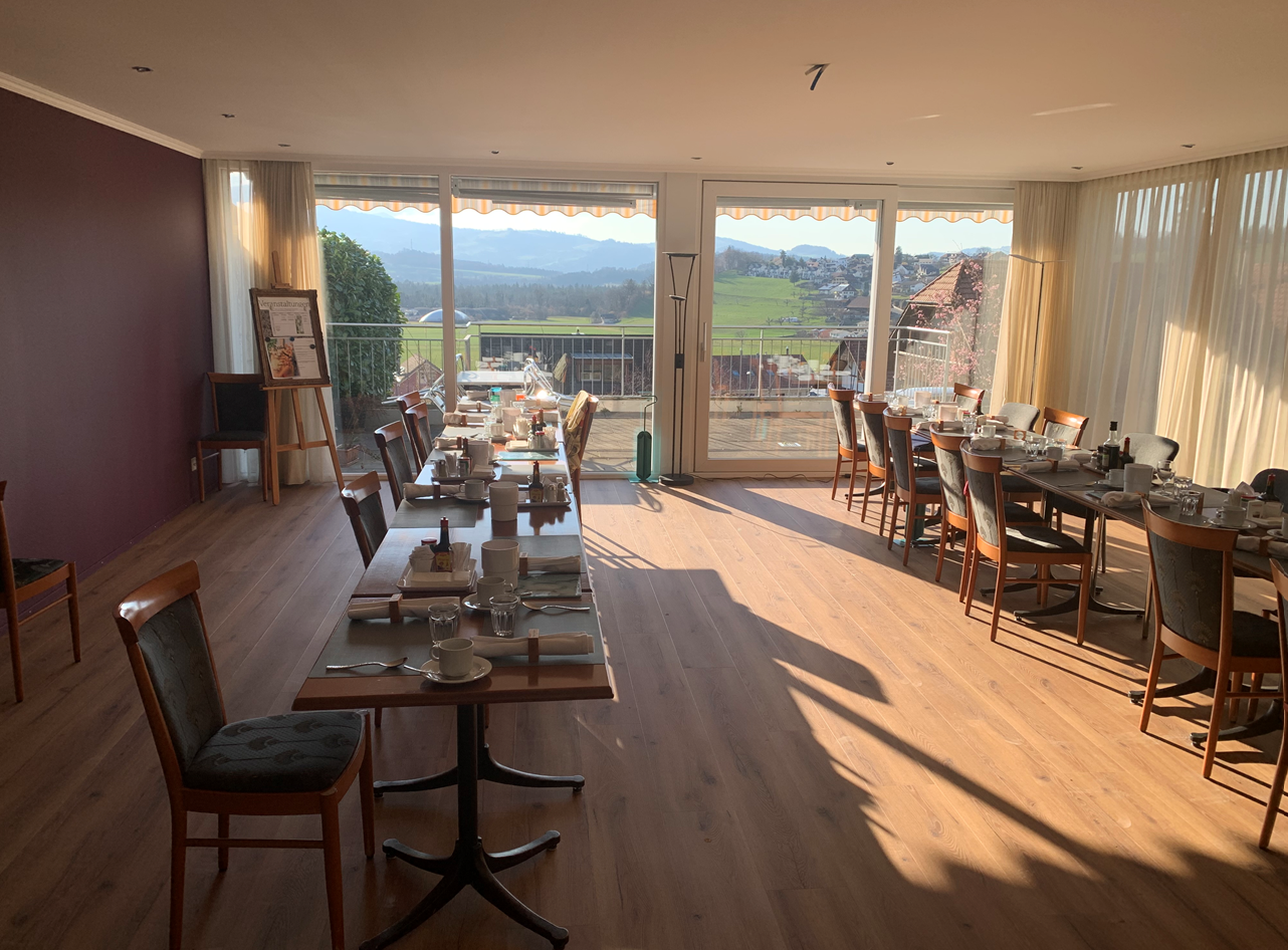 Unsere Bewohnerinnen und Bewohner essen im frisch sanierten Salon. Dies als Übergang während den Sanierungsarbeiten im Speisesaal Wohnhuus Gantrisch.